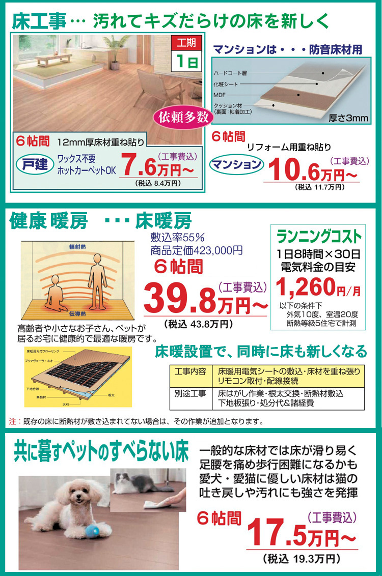 | 貼り替えの場合(お勧めの床材で) | 6帖間 | 19.6万円 (税込 21.6万円) | 既存の床板を全てはがして行なう方法、下地から遣り直しですので丈夫で長持ち、床材(12mm)はワックス不要のもの、床下に断熱材を敷き込みます。 | |